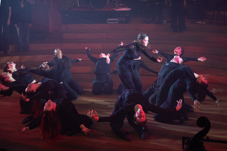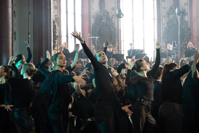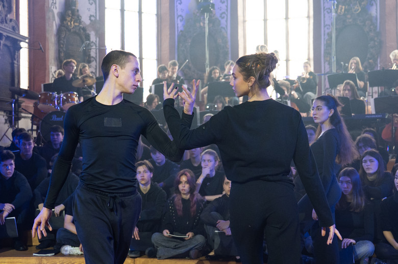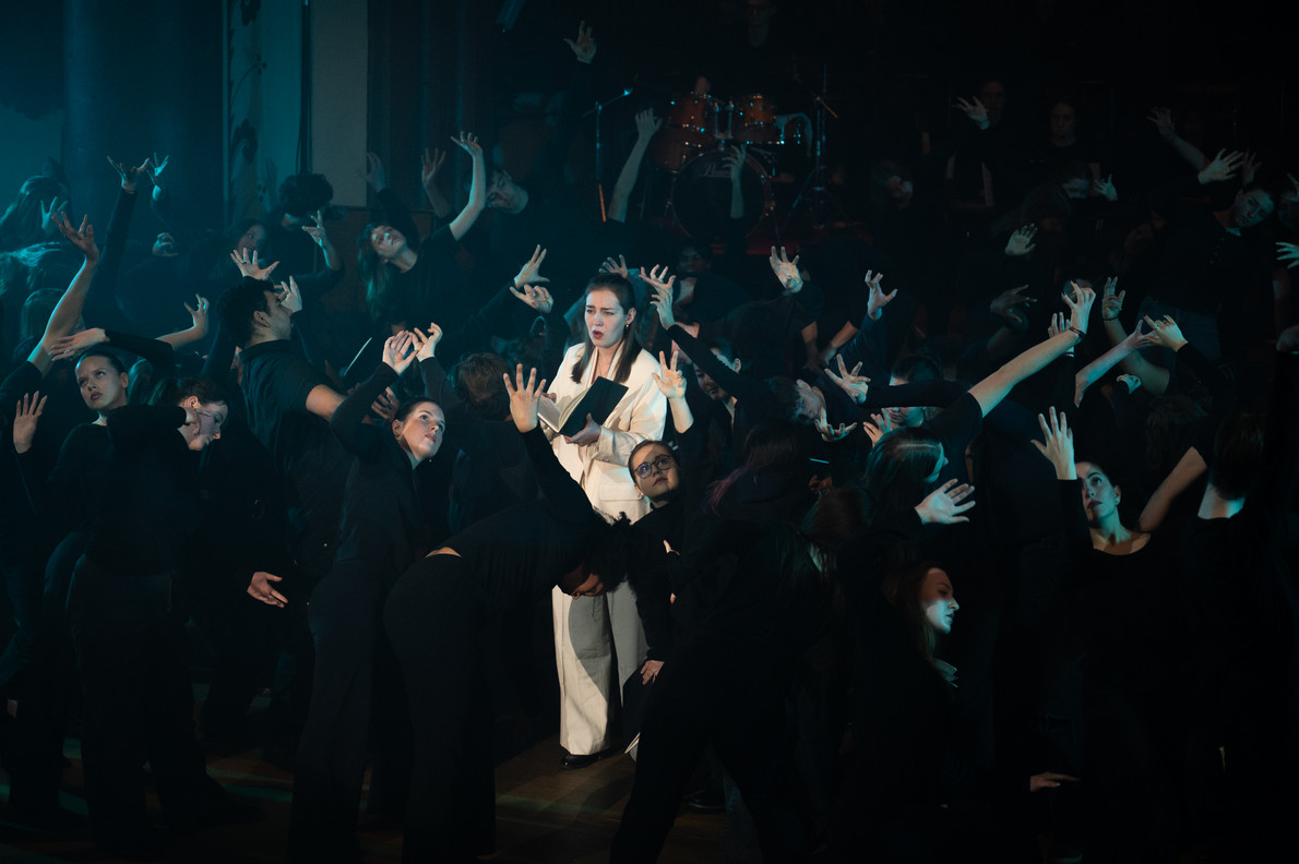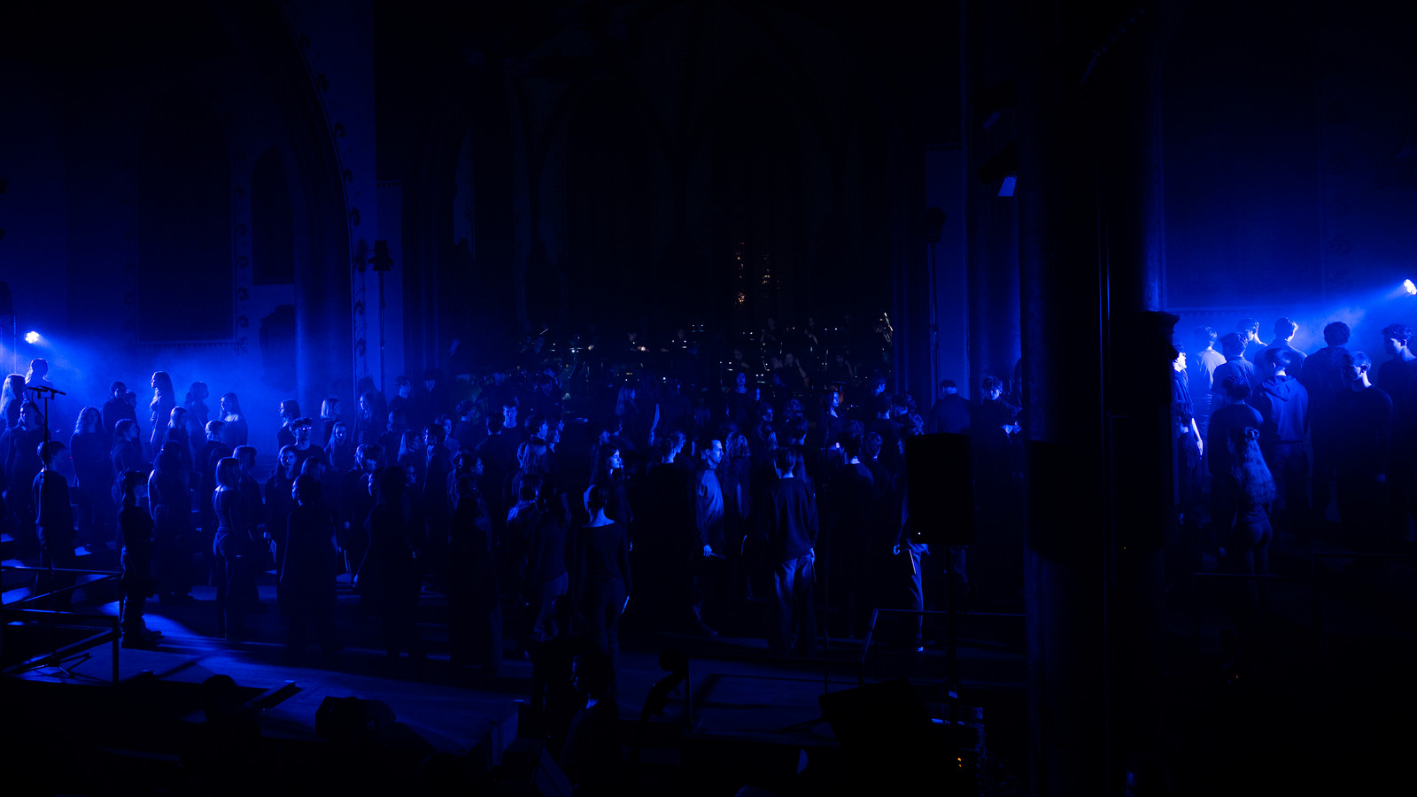 Mit den Mitwirkenden haben wir einen szenischen Ablauf gestaltet, der nur in Ansätzen eine Geschichte erzählen wollte. Wichtiger waren die räumlichen Spannungsbögen, die Verhältnisse zwischen Gruppe und Individuum sowie das, was unaussprechlich bleiben muss.